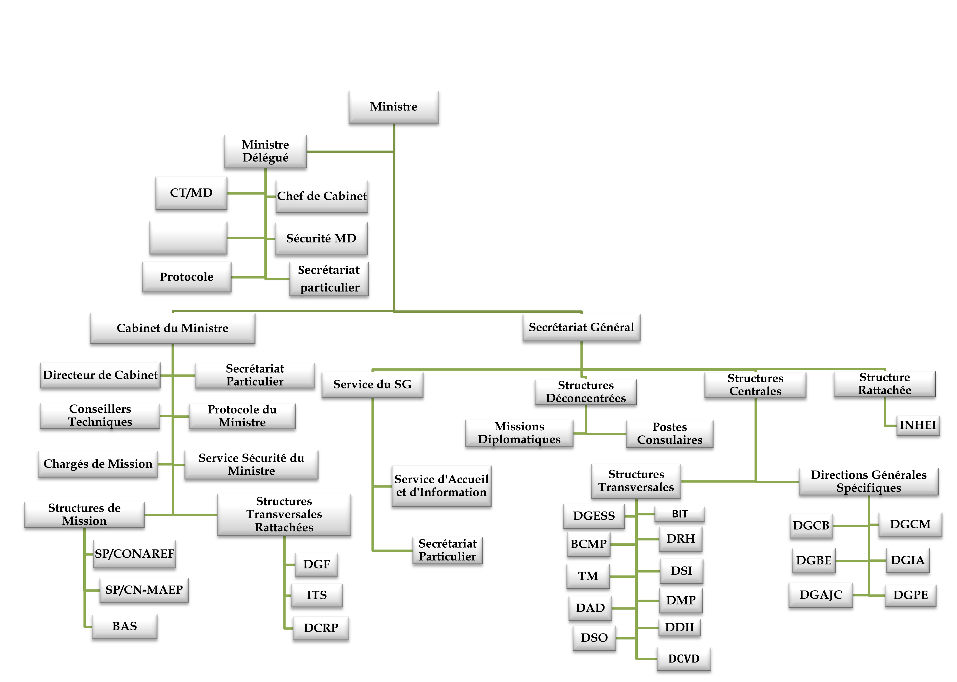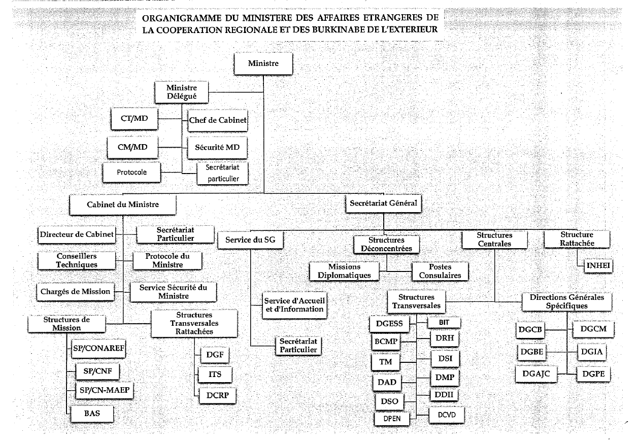 Conformément aux dispositions de ce Décret, le Ministère des Affaires étrangères, de la Coopération régionale et des Burkinabè de l’Extérieur comprend les structures suivantes :
