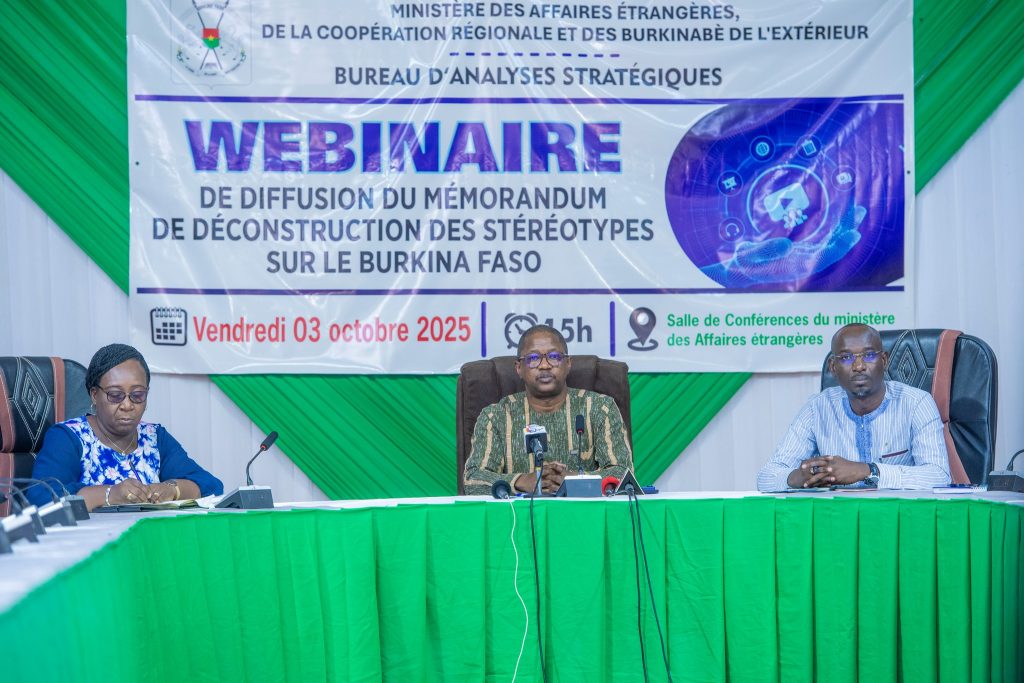 Le ministre des Affaires étrangères, de la Coopération régionale et des Burkinabè de l’Extérieur, S.E.M. Karamoko Jean Marie TRAORE accompagné de Mme Bêbgnasgnan Eldine KABRE/KABORE, ministre délégué chargé de la Coopération régionale et des cadres du ministère, a présidé le vendredi 3 octobre 2025, un webinaire consacré à la diffusion du mémorandum de déconstruction des stéréotypes sur le Burkina Faso.